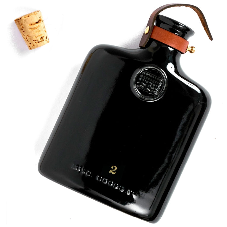 Designed to reference the historic culture of distilling spirits, this classic ceramic flask is newly designed but with a nod to its predecessors. It is a drinking flask made for the casual picnic, bar top or mantle. Accented with embossing and leather fastening with brass hardware.