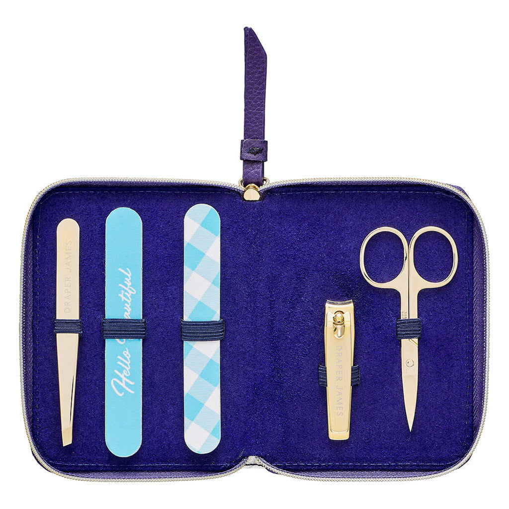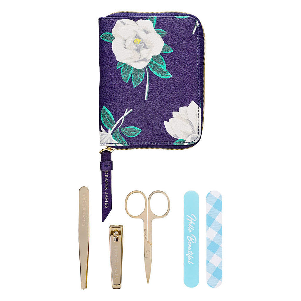 The Magnolia Manicure Set by Draper James is a beautiful Magnolia print zip pouch with a leaf zip pull and pebble faux leather finish.