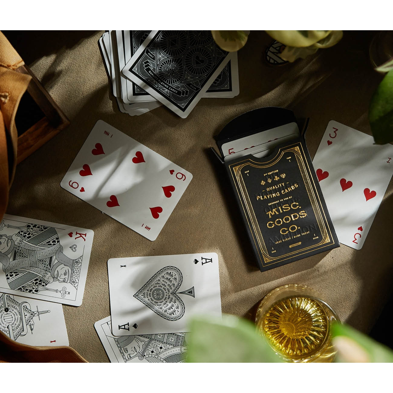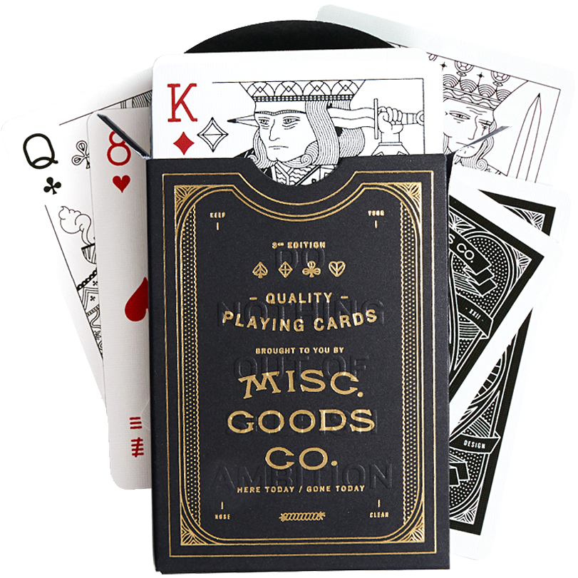 Misc. Goods Co. owner Tyler Deeb released his first deck of newly illustrated playing cards on Kickstarter in 2012 after three months of feverish design and attention. Each drawing on every playing card is re-imagined. The illustrations of the characters, symbols and each letter and number new.