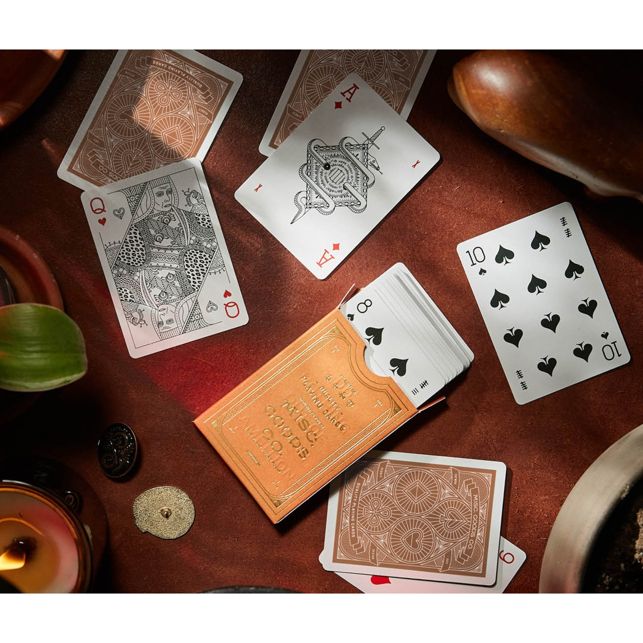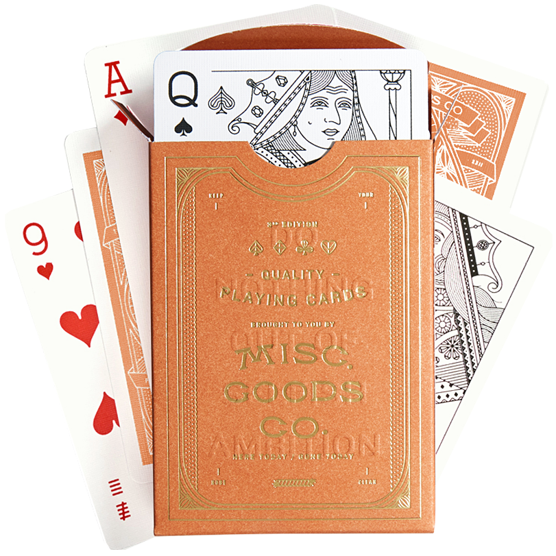 Misc. Goods Co. owner Tyler Deeb released his first deck of newly illustrated playing cards on Kickstarter in 2012 after three months of feverish design and attention. Each drawing on every playing card is re-imagined. The illustrations of the characters, symbols and each letter and number new.