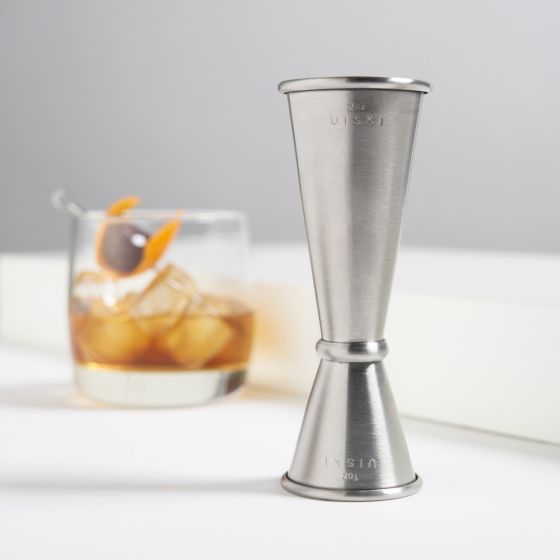 Cast in lustrous stainless steel with a band to separate its one- and two-ounce sections, the interior of each side of our professional Japanese-style double jigger is scored with pinpoint mixology measurements (1.5, 0.75 and 0.5 ounces).