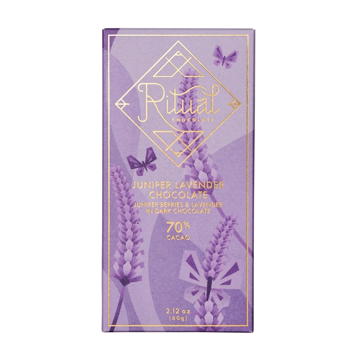 Juniper Lavender: Cacao, Organic Cane Sugar, Organic Cocoa Butter, Dried Juniper Berries, Culinary Lavender