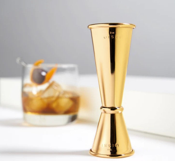 Cast in lustrous gold with a band that separates its one- and two-ounce sections, the interior of each side of our professional Japanese-style double jigger is scored with pinpoint mixology measurements (1.5, 0.75 and 0.5 ounces).