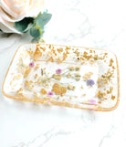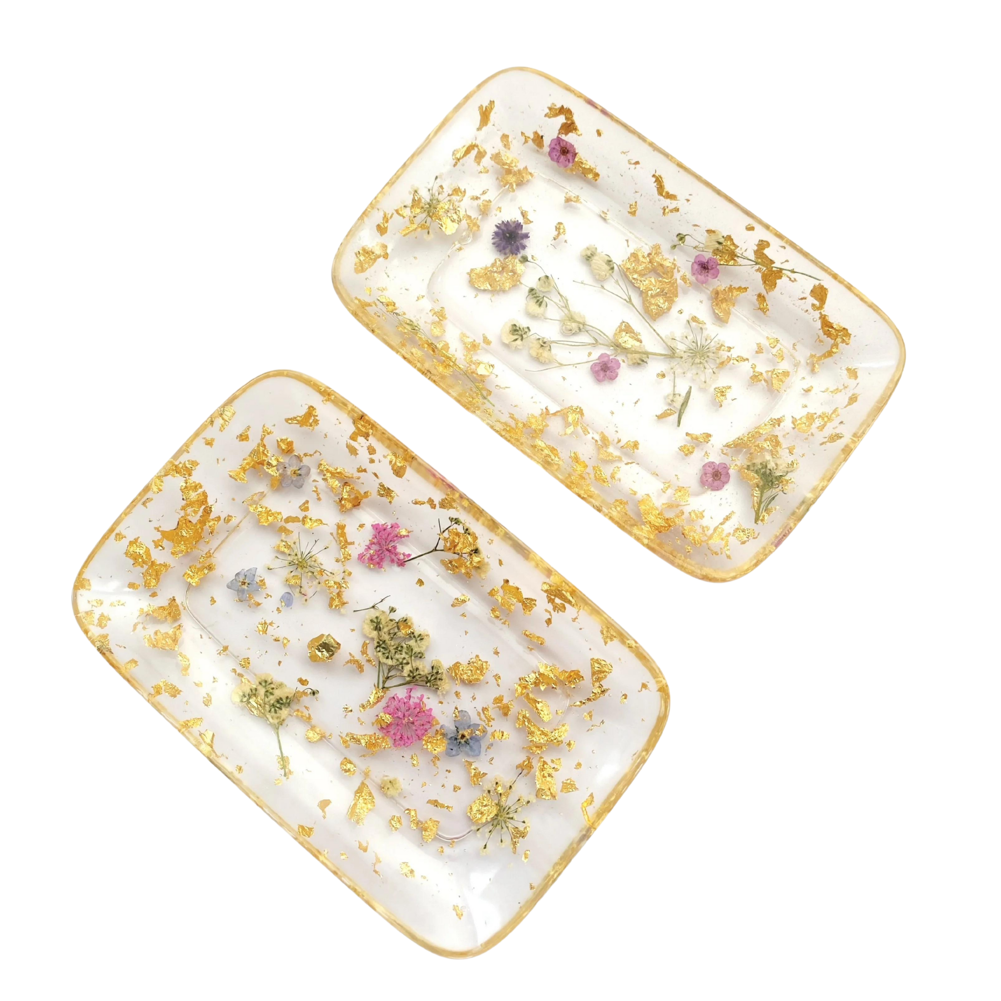 The gold leaf gives them an elegant look with baby's breath and a few purple, pink or forget me not flowers in between. Because this product is handmade, items will vary in design and placement of flowers and flakes.