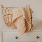 Our gauze blankets are made from 6 layers of luxurious cotton gauze. All of our swaddles and blankets are light weight, breathable, and versatile. We love using these gauze blankets to snuggle with on the couch, in the stroller or use in the crib as babies first blanket.