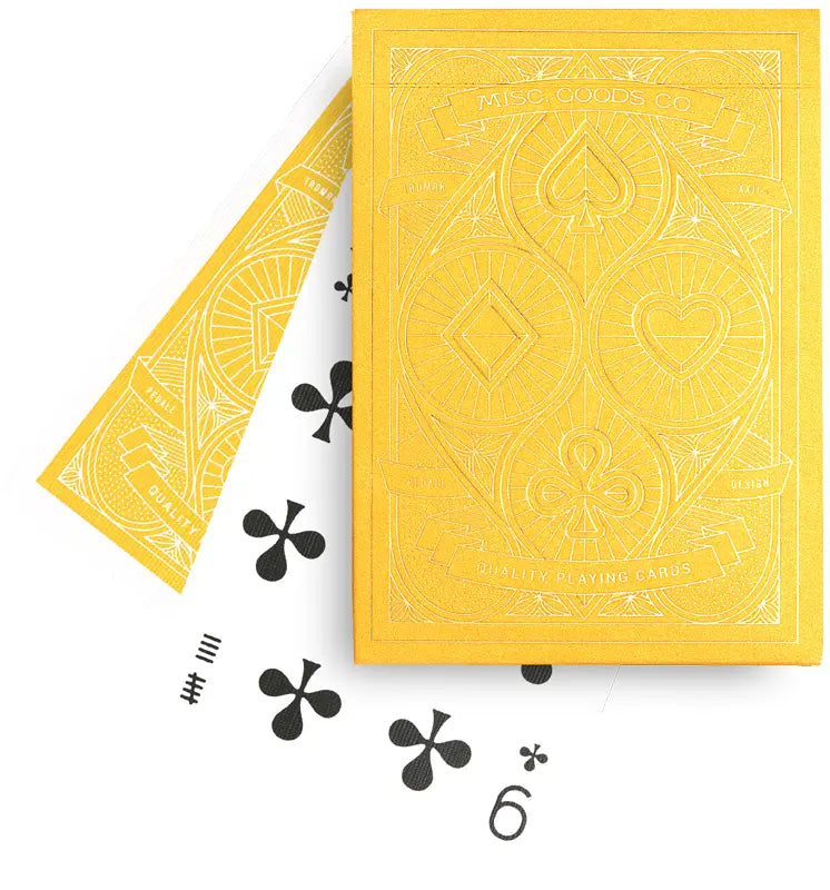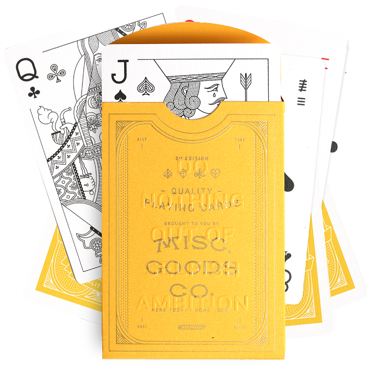 Misc. Goods Co. owner Tyler Deeb released his first deck of newly illustrated playing cards on Kickstarter in 2012 after three months of feverish design and attention. Each drawing on every playing card is re-imagined. The illustrations of the characters, symbols and each letter and number new.