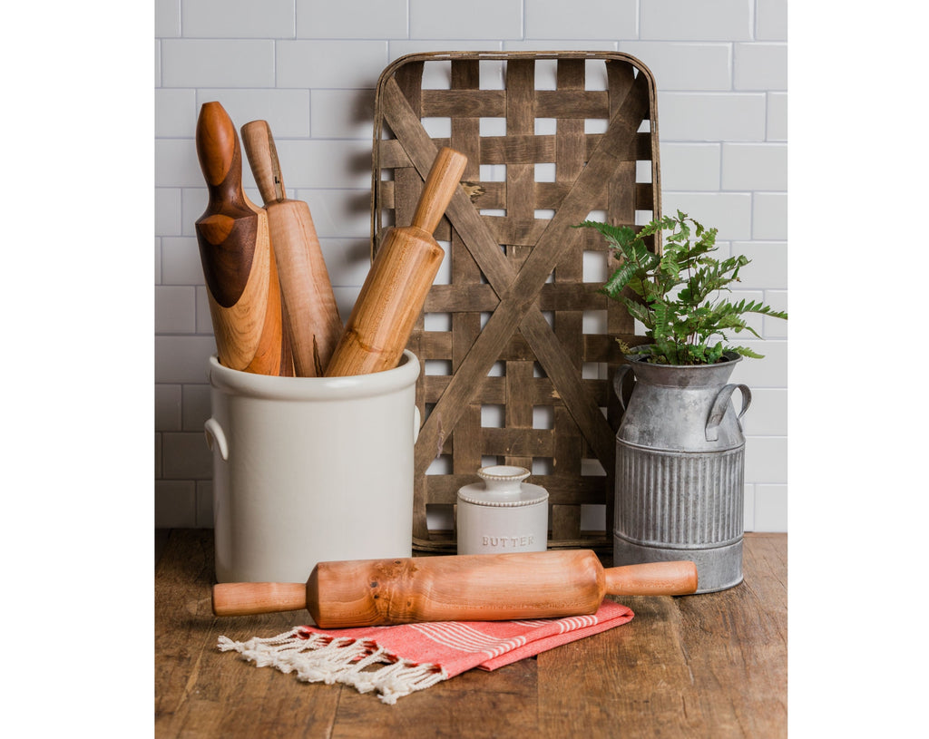 The traditional rolling pin: although they're mass produced around the world, most kitchens do not have a proper rolling pin. Our handmade pieces of functional art tell a different story. We have taken the iconic look and updated it with beautiful woods from my parents' farm in Tennessee. The grain of the different woods makes them an easy sell for anyone who likes to bake (or a gift for anyone who likes to bake).
